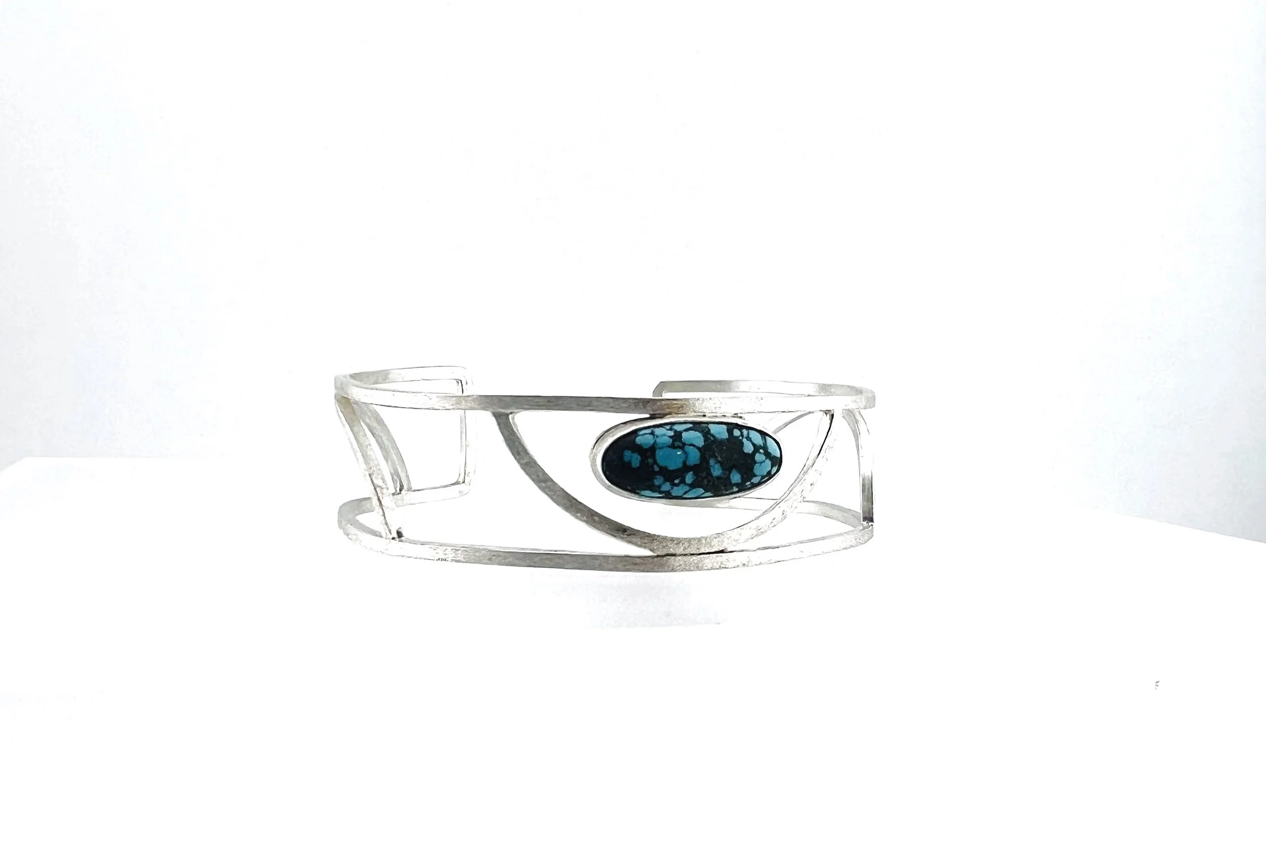 Sterling square wire cuff with AZ Carico turquoise. Size medium. Inv. 25030. $268.00