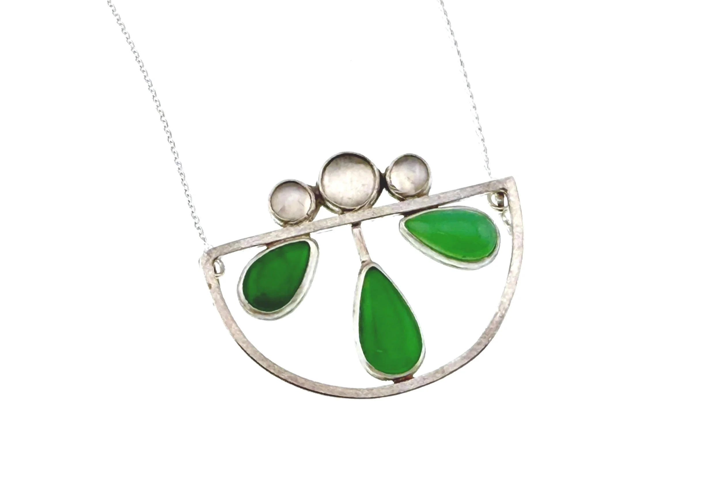 Sterling minimalist pendant 2.5”x 1.75”, moonstone/chrysoprase cabs. 18” length. Inv. 25146 $429.00