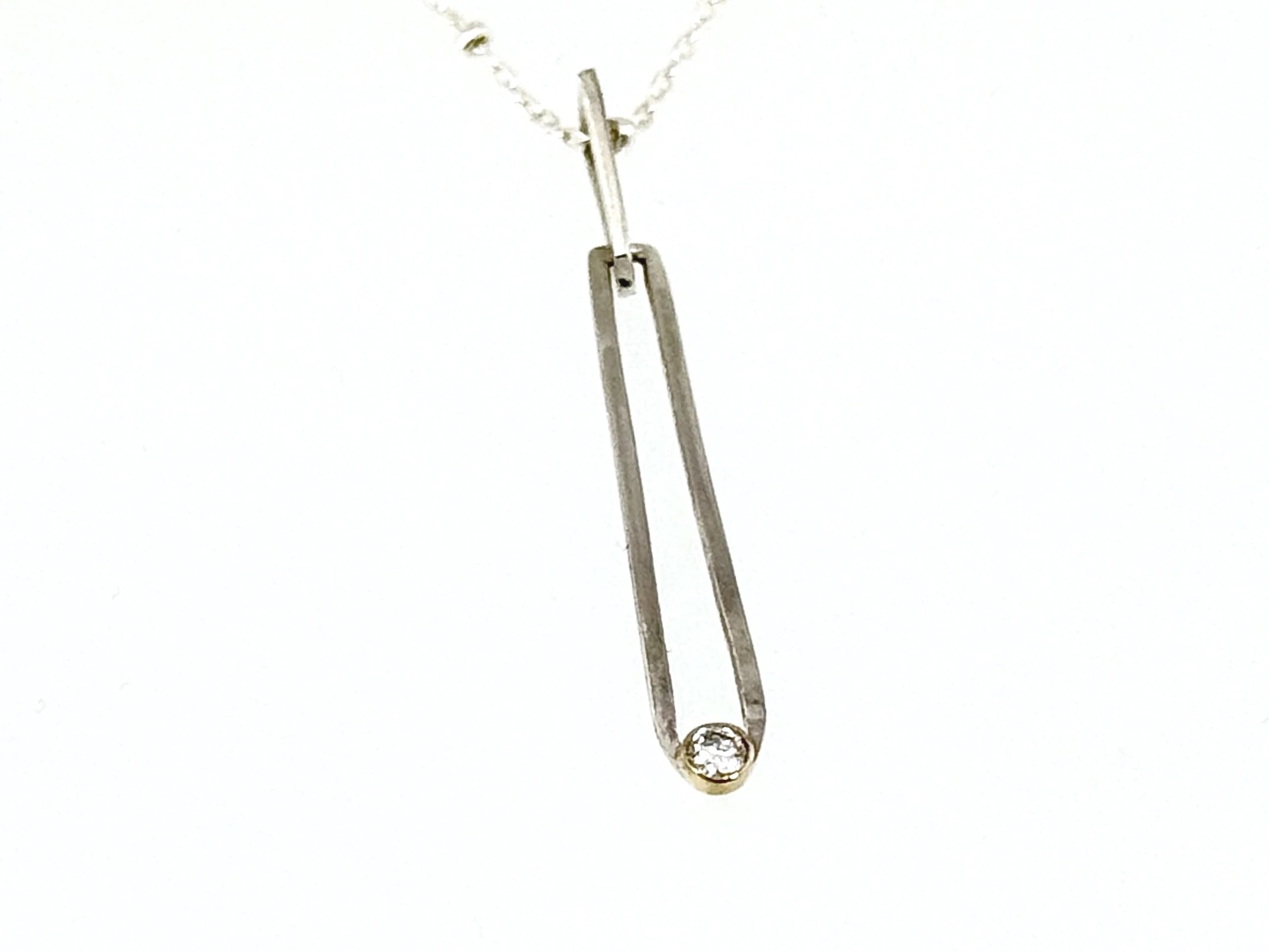 A 2.6 mm brilliant cut diamond set in 18k, encased in sterling silver. 2’’x.5”. Inv. 25149 Chain 18 inch sterling.