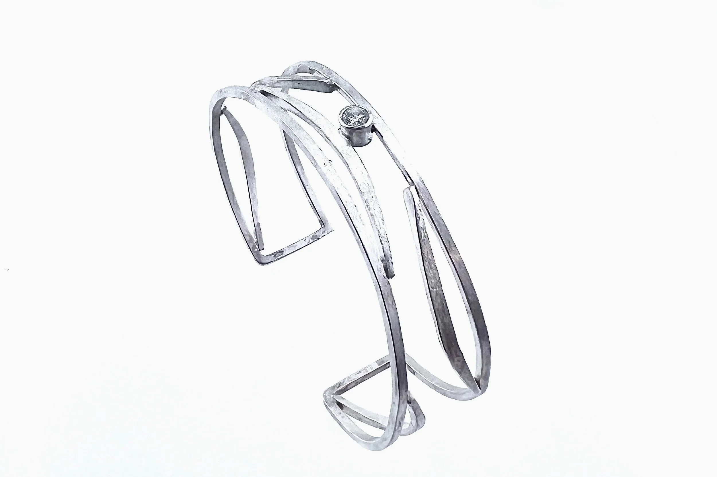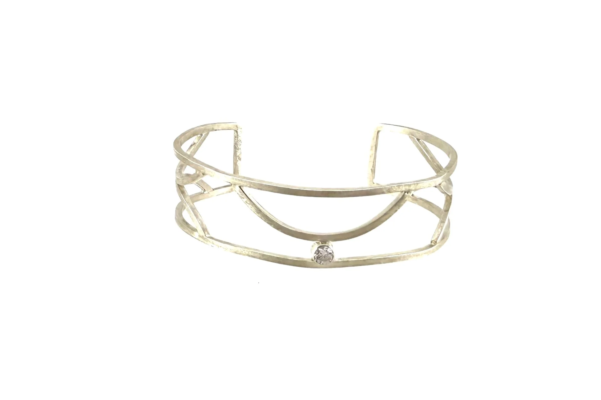 Hand forged center elements within sterling square wire framework cuff. M/L. Inv. 25028 $239.00